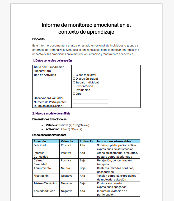 El informe de monitoreo emocional se centra en la evaluación sistemática del estado afectivo de estudiantes durante procesos de aprendizaje, tanto en modalidades presenciales como virtuales. Su propósito es documentar y analizar cómo las emociones influyen directamente en la motivación, capacidad de atención y rendimiento académico de los participantes en actividades educativas.