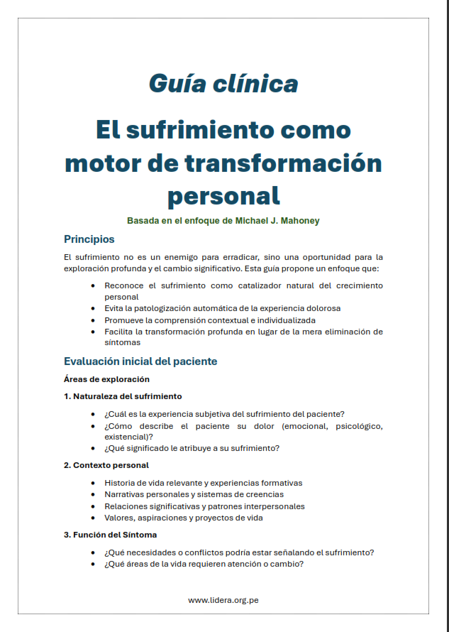El documento presenta un enfoque innovador de psicoterapia basado en las investigaciones de Michael J. Mahoney, que propone ver el sufrimiento no como un problema a eliminar, sino como un catalizador poderoso para la transformación personal profunda. Argumenta que cuando las personas enfrentan su dolor emocional, psicológico o existencial en un entorno terapéutico adecuado, este sufrimiento puede convertirse en la fuerza que las impulsa a cuestionar sus creencias, valores y patrones de comportamiento, abriendo la puerta a cambios significativos.
